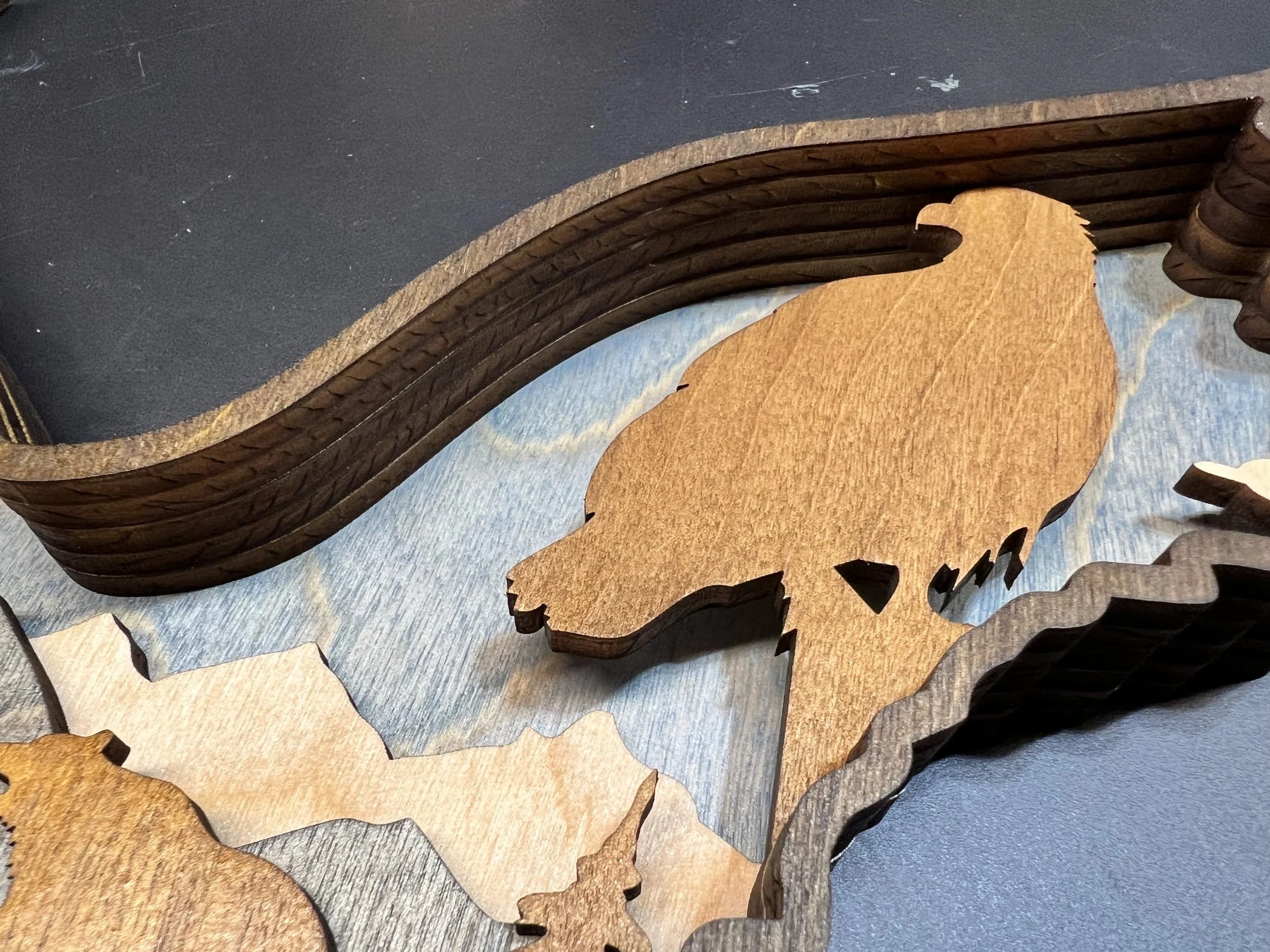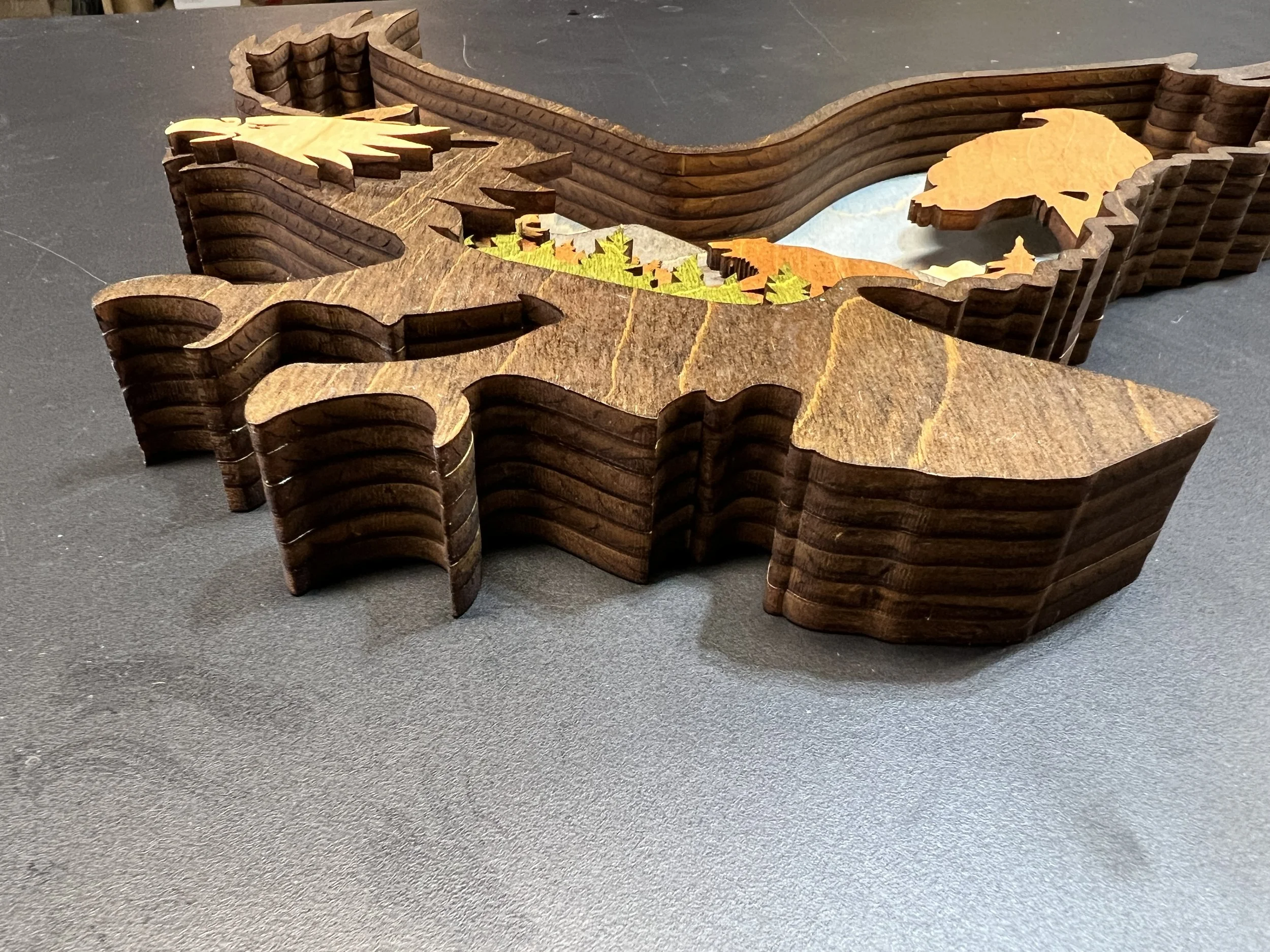 This 3D Multi-Layered Eagle features a detailed mountain/forest scene inside. It is laser cut, each of the 9 layers is hand sanded and then stained for a truly remarkable presentation.